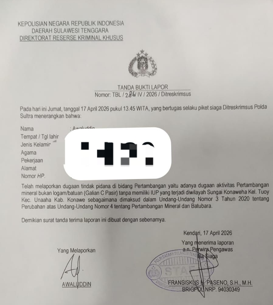 KlikJurnal.Com. KONAWE – Aliansi Masyarakat Peduli Hukum (Ampuh) Sulawesi Tenggara (Sultra) mengambil langkah tegas dengan melaporkan dugaan aktivitas Pertambangan Tanpa Izin (PETI) di bantaran Kali Konaweeha ke pihak kepolisian, Jumat (17/4/2026).