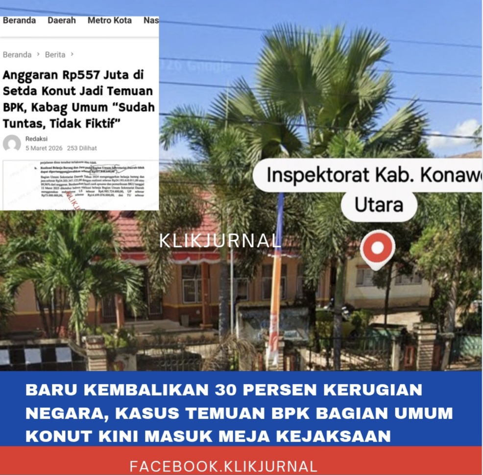KlikJurnal.Com, KONAWE UTARA – Kasus temuan Badan Pemeriksa Keuangan (BPK) tahun anggaran 2024 di Bagian Umum Sekretariat Daerah (Setda) Kabupaten Konawe Utara (Konut) mulai memasuki babak baru. Meski administrasi dinyatakan tuntas, namun pengembalian kerugian negara hingga kini dilaporkan baru mencapai 30 persen.