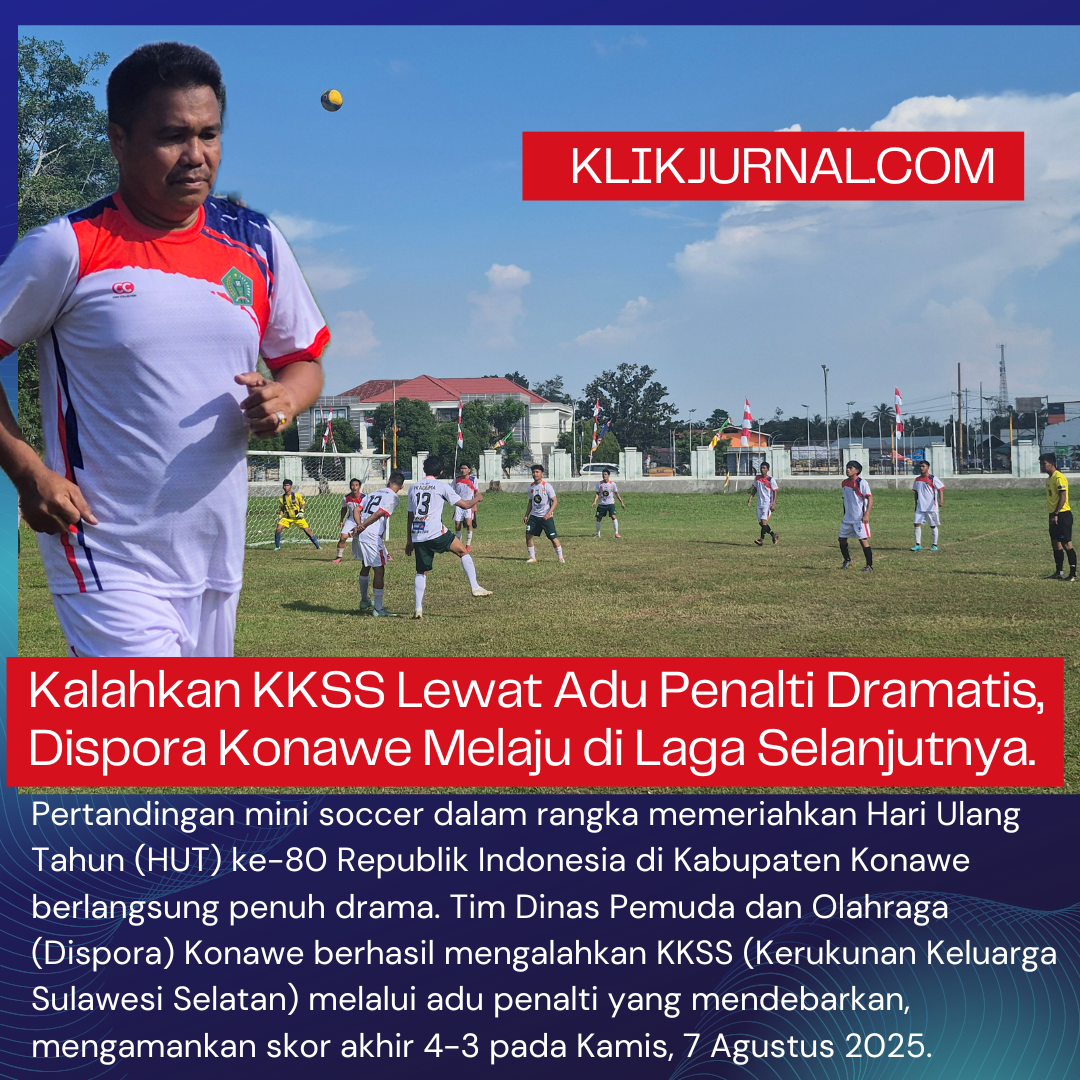 KlikJurnal.Com, KONAWE – Pertandingan mini soccer dalam rangka memeriahkan Hari Ulang Tahun (HUT) ke-80 Republik Indonesia di Kabupaten Konawe berlangsung penuh drama. Tim Dinas Pemuda dan Olahraga (Dispora) Konawe berhasil mengalahkan KKSS (Kerukunan Keluarga Sulawesi Selatan) melalui adu penalti yang mendebarkan, mengamankan skor akhir 4-3 pada Kamis, 7 Agustus 2025.