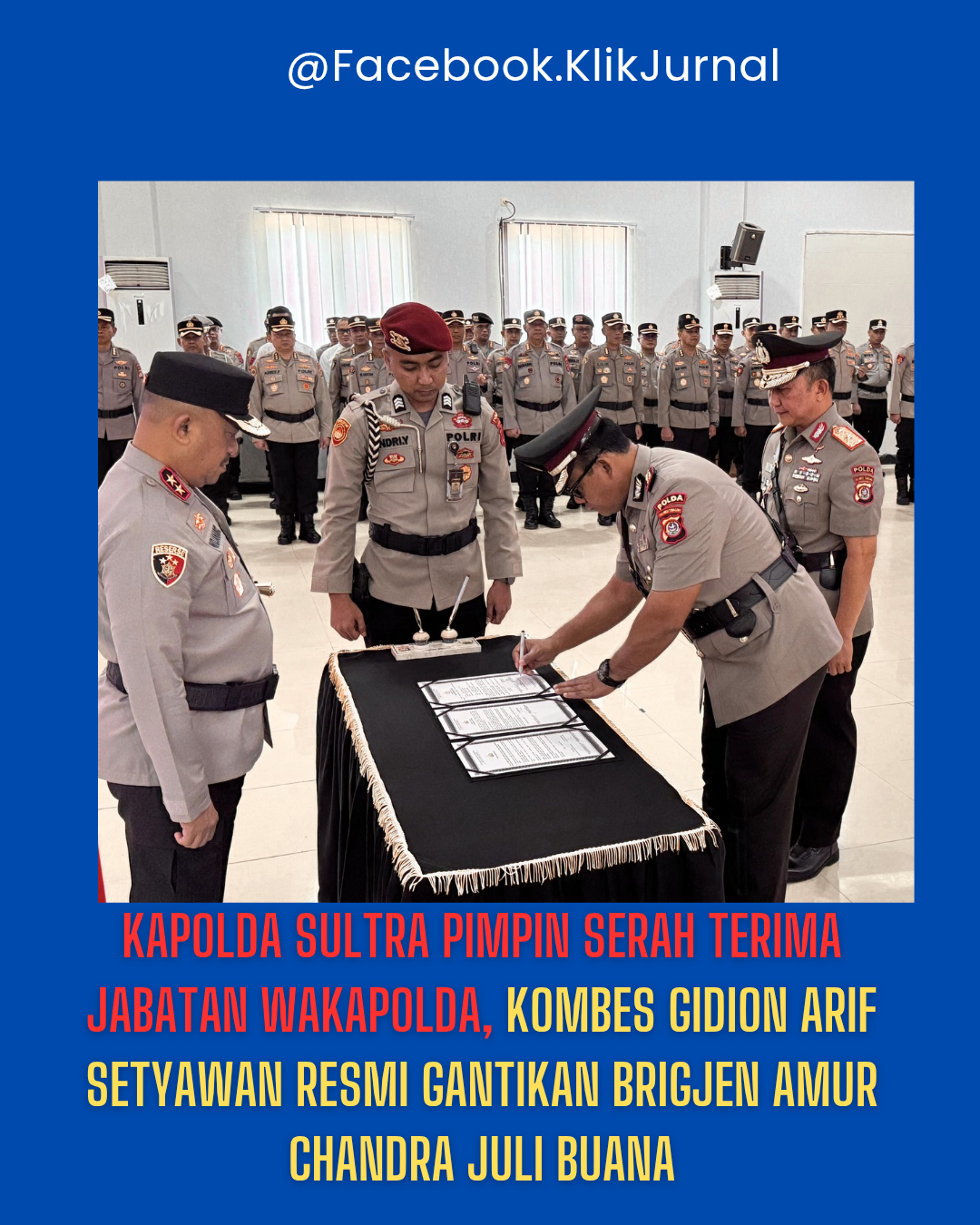 KlikJurnal.Com. KENDARI – Kapolda Sulawesi Tenggara (Sultra) Irjen Pol Didik Agung Widjanarko memimpin upacara serah terima jabatan (sertijab) Wakapolda Sultra di Aula Dachara, pada Selasa, 12 Agustus 2025. Jabatan Wakapolda yang sebelumnya diemban oleh Brigjen Pol Amur Chandra Juli Buana, kini diserahkan kepada Kombes Pol Gidion Arif Setyawan.