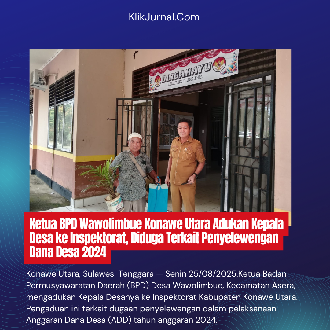 KlikJurnal.Com, Konawe Utara, Sulawesi Tenggara — Senin 25/08/2025.Ketua Badan Permusyawaratan Daerah (BPD) Desa Wawolimbue, Kecamatan Asera Kabupaten Konawe utara Sulawesi Tenggara, mengadukan Kepala Desanya ke Inspektorat Kabupaten Konawe Utara. Pengaduan ini terkait dugaan penyelewengan dalam pelaksanaan Anggaran Dana Desa (ADD) tahun anggaran 2024.