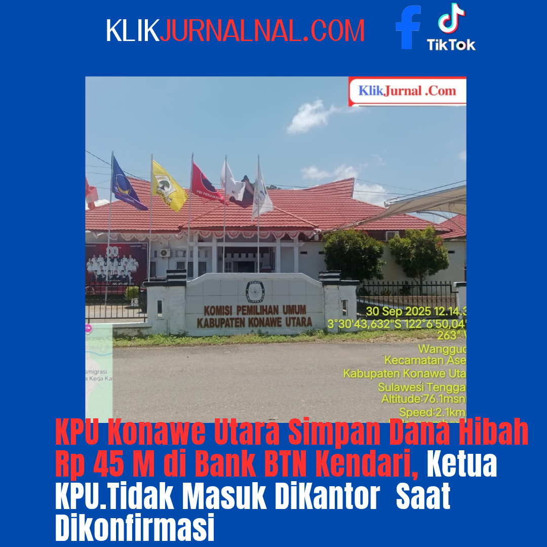 KlikJurnal.Com. KONAWE UTARA – Kebijakan Komisi Pemilihan Umum Daerah (KPUD) Konawe Utara yang menitipkan dana hibah Pilkada senilai Rp45 miliar di Bank BTN Kendari, sebuah bank BUMN, menimbulkan pertanyaan besar. Pasalnya, Ketua KPU Konawe Utara, Abdul Makmur, S.Pd., M.Pd.tidak Masuk kantor saat media saat coba dikonfirmasi oleh media terkait mekanisme kerja sama ini.