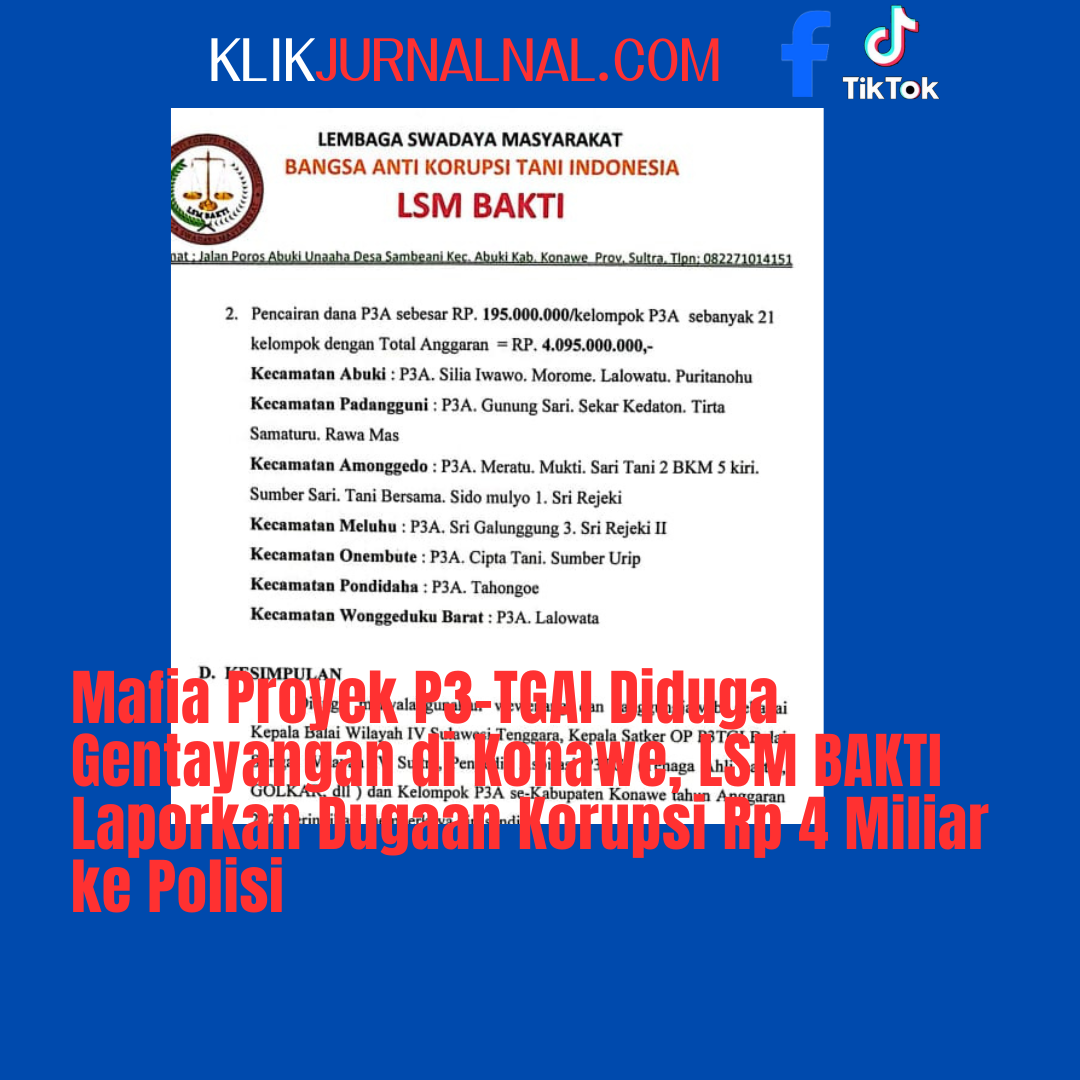 KlikJurnal.Com.Konawe – Dugaan skandal korupsi dalam Program Percepatan Peningkatan Tata Guna Air Irigasi (P3-TGAI) tahun anggaran 2025 di Kabupaten Konawe, Sulawesi Tenggara, mencuat ke permukaan. Lembaga Swadaya Masyarakat Bangsa Anti Korupsi Tani Indonesia (LSM BAKTI) secara resmi melaporkan dugaan penyelewengan dana senilai Rp 4,095 miliar yang seharusnya diperuntukkan bagi 21 kelompok Perkumpulan Petani Pemakai Air (P3A).