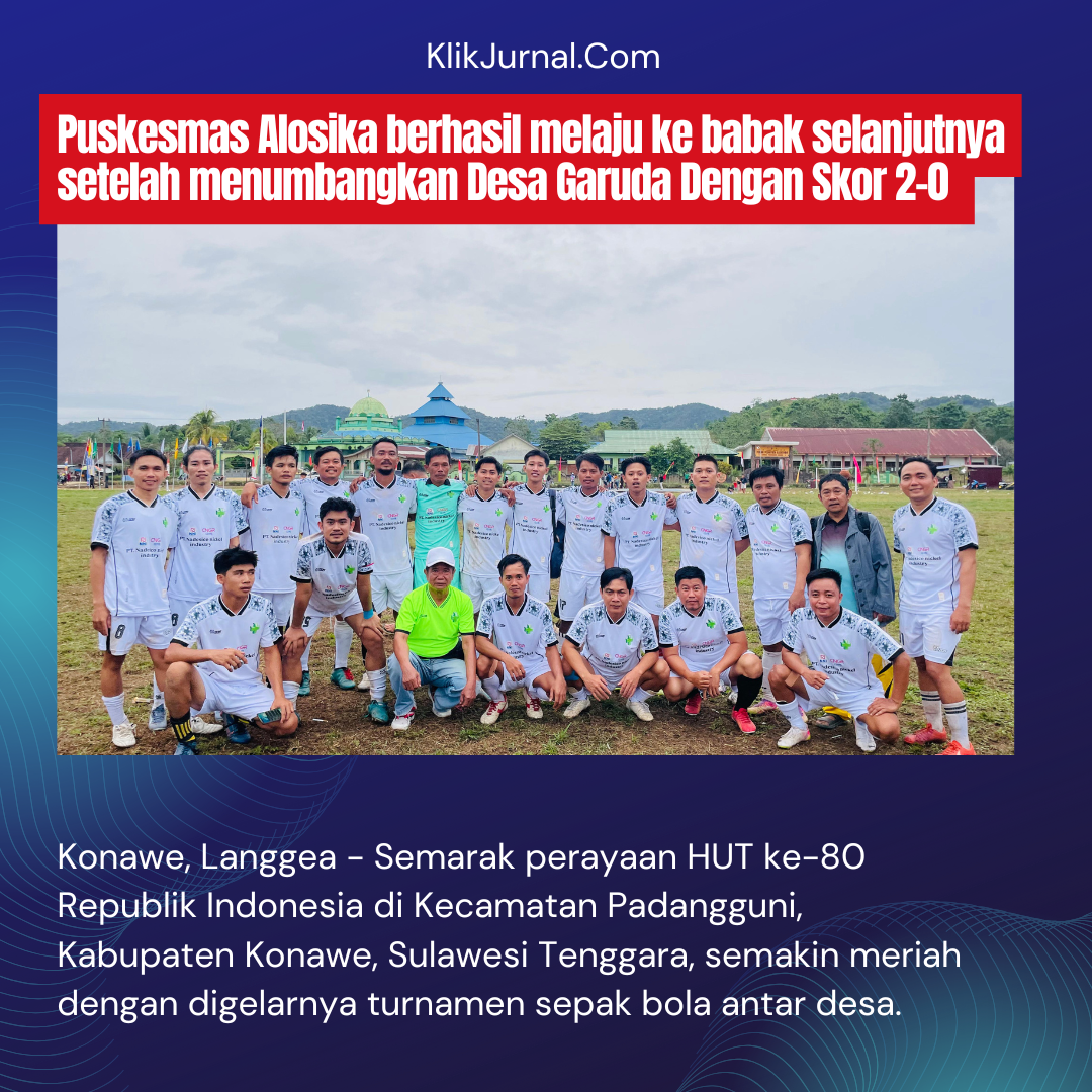KlikJurnal.Com. Konawe, Langgea – Semarak perayaan HUT ke-80 Republik Indonesia di Kecamatan Padangguni, Kabupaten Konawe, Sulawesi Tenggara, semakin meriah dengan digelarnya turnamen sepak bola antar desa. Dalam pertandingan sengit yang berlangsung di Lapangan Desa Langgea, tim Puskesmas Alosika berhasil melaju ke babak selanjutnya setelah menumbangkan Desa Garuda dengan skor 2-0 pada Minggu (24/08/2025).