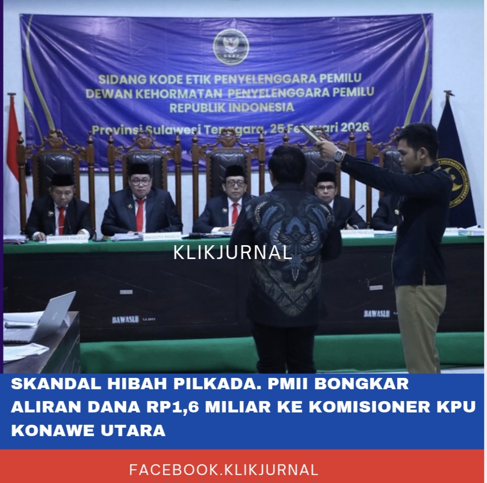 KlikJurnal.KONAWE – Sidang kode etik penyelenggara pemilu mendadak riuh setelah Ketua Pengurus Cabang Pergerakan Mahasiswa Islam Indonesia (PC PMII) Kabupaten Konawe, Harbiansyah, membeberkan dugaan skandal aliran dana jumbo yang menyeret pimpinan KPU Konawe Utara (Konut).