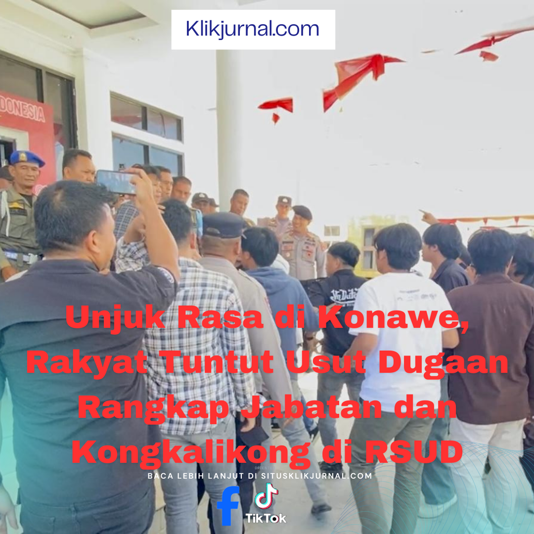 KlikJurnal.Com. Konawe – Puluhan massa yang tergabung dalam Aliansi Rakyat Kabupaten Konawe menggelar aksi unjuk rasa di Kantor DPRD dan Pemerintah Daerah (Pemda) Konawe pada Rabu (20/8/2025). Aksi ini menuntut DPRD dan Pemda untuk mengusut tuntas dugaan pelanggaran etik dan maladministrasi di Rumah Sakit Umum Daerah (RSUD) Kabupaten Konawe.