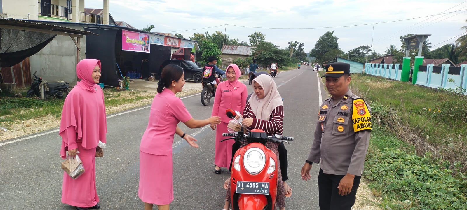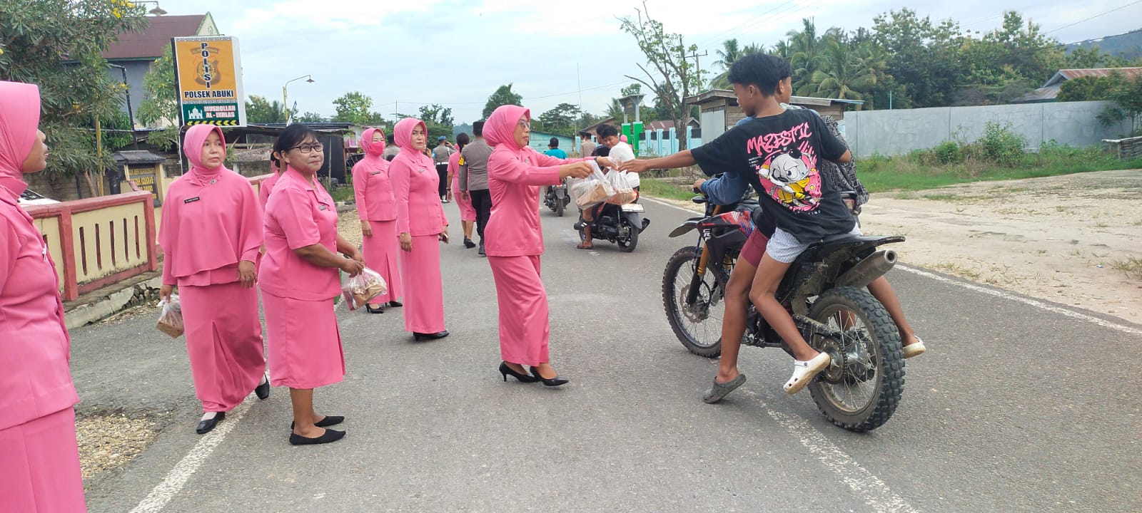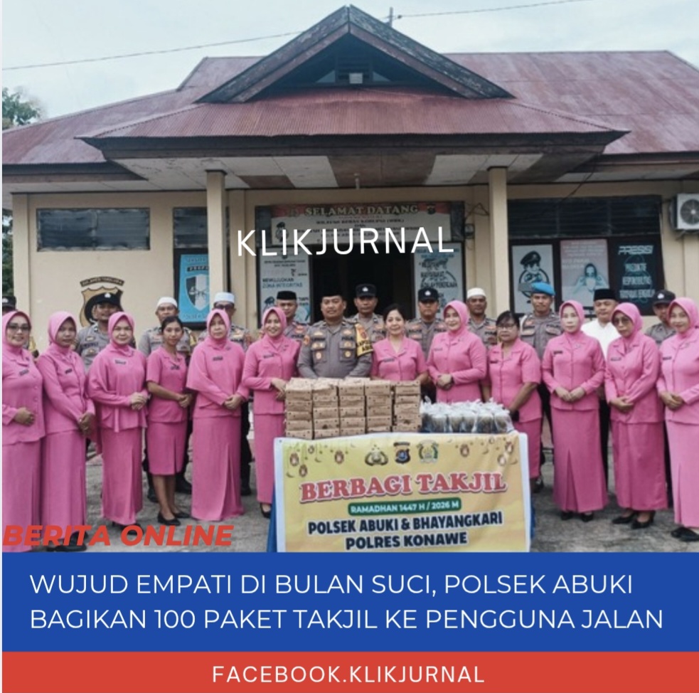 KlikJurnal.Com, KONAWE – Jajaran Kepolisian Sektor (Polsek) Abuki bersama Bhayangkari Ranting Abuki menggelar aksi sosial dengan membagikan paket takjil gratis kepada masyarakat dan pengguna jalan yang melintas di depan Mako Polsek Abuki, Sabtu (21/2/2026).